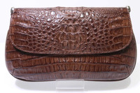 Женская сумка-клатч из натуральной фактурной крокодиловой кожи темно коричневого цвета. Сумка клатч данной модели приглянется ем из вас, кто ищет небольшую по размеру плечевую сумочку из крокодиловой кожи, у которой при необходимости можно отстегнуть плечевой ремень и пользоваться сумкой как ручным клатчем. Крокодиловая сумка клатч прямоугольной формы с округлениями нижних углов на сумке. На лицевой части устроен откидывающийся вверх лицевой клапан, в нижней части клапан фиксируется на металлическую магнитную кнопку. Центральная часть клапана украшена натуральным фактурным крокодиловым затылком. На лицевой части крокодилового клатча мы видим фактурную спинную часть крокодиловой шкуры. Обратная сторона сумки выполнена с применением крокодиловой кожи с фактурной спинной частью. Внутри сумки, под лицевым клапаном расположены D-образные кольца для крепления плечевого ремешка. Съемная металлическая цепочка, с оплеткой полосой из натуральной кожи теленка используется как плечевой ремень и идет в комплекте с сумкой. Внутри сумка-клатч выполнены в одном объеме, для дополнительного удобства пользования выполнены накладные и карманы на молнии. Внутренняя отделка, сумки-комбинированная из натуральной кожи теленка подобранной по цвету под цвет крокодиловой кожи и текстиля.