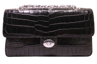 Женская сумка из натуральной крокодиловой кожи черного цвета, сумка в стиле Шанель размер сумки 11 дюймов. Ширина-27см. Высота-16см. Толщина -9см. Для пошива сумок данной модели используется натуральная кожа сиамского крокодила брюшная часть. Крокодиловая кожа высокого качества выделки и окраса, кожа мягкая, упругая и эластичная, очень приятая на ощупь. На лицевой поверхности сумки распложен откидывающийся вверх лицевой клапан, в нижней части клапан крепится на поворотный замок. Все внешние части сумки: лицевой клапан, лицевая поверхность под клапаном, обратная часть сумки, дно и боковые вставки, все эти поверхности выполнены из натуральной крокодиловой кожи. В верхней части сумки устроен плечевой ремень, плечевой ремень в виде металлической цепочки оплетенной кожей теленка, цвет кожи теленка подобран под цвет крокодиловой кожи. Плоским карманам на молнии крокодиловая сумка внутри разделена на два отделения, для дополнительного удобства пользования внутри сумки устроены удобные карманы, накладные и карман на молнии. В качестве материала подклада использована натуральная кожа теленка, цвет кожи теленка подобран под цвет крокодиловой кожи.