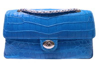 Женская сумка из натуральной крокодиловой кожи голубого цвета, сумка в стиле Шанель размер сумки 11 дюймов. Ширина-27см. Высота-16см. Толщина -9см. Для пошива сумок данной модели используется натуральная кожа сиамского крокодила брюшная часть. Крокодиловая кожа высокого качества выделки и окраса, кожа мягкая, упругая и эластичная, очень приятая на ощупь. На лицевой поверхности сумки распложен откидывающийся вверх лицевой клапан, в нижней части клапан крепится на поворотный замок. Все внешние части сумки: лицевой клапан, лицевая поверхность под клапаном, обратная часть сумки, дно и боковые вставки, все эти поверхности выполнены из натуральной крокодиловой кожи. В верхней части сумки устроен плечевой ремень, плечевой ремень в виде металлической цепочки оплетенной кожей теленка, цвет кожи теленка подобран под цвет крокодиловой кожи. Плоским карманам на молнии крокодиловая сумка внутри разделена на два отделения, для дополнительного удобства пользования внутри сумки устроены удобные карманы, накладные и карман на молнии. В качестве материала подклада использована натуральная кожа теленка, цвет кожи теленка подобран под цвет крокодиловой кожи.