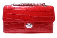 Женская сумка из натуральной крокодиловой кожи красного цвета, сумка в стиле Шанель размер сумки 11 дюймов. Ширина-27см. Высота-16см. Толщина -9см. Для пошива сумок данной модели используется натуральная кожа сиамского крокодила брюшная часть. Крокодиловая кожа высокого качества выделки и окраса, кожа мягкая, упругая и эластичная, очень приятая на ощупь. На лицевой поверхности сумки распложен откидывающийся вверх лицевой клапан, в нижней части клапан крепится на поворотный замок. Все внешние части сумки: лицевой клапан, лицевая поверхность под клапаном, обратная часть сумки, дно и боковые вставки, все эти поверхности выполнены из натуральной крокодиловой кожи. В верхней части сумки устроен плечевой ремень, плечевой ремень в виде металлической цепочки оплетенной кожей теленка, цвет кожи теленка подобран под цвет крокодиловой кожи. Плоским карманам на молнии крокодиловая сумка внутри разделена на два отделения, для дополнительного удобства пользования внутри сумки устроены удобные карманы, накладные и карман на молнии. В качестве материала подклада использована натуральная кожа теленка, цвет кожи теленка подобран под цвет крокодиловой кожи.