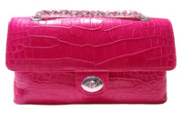 Женская сумка из натуральной крокодиловой кожи малинового цвета, сумка в стиле Шанель размер сумки 11 дюймов. Ширина-27см. Высота-16см. Толщина -9см. Для пошива сумок данной модели используется натуральная кожа сиамского крокодила брюшная часть. Крокодиловая кожа высокого качества выделки и окраса, кожа мягкая, упругая и эластичная, очень приятая на ощупь. На лицевой поверхности сумки распложен откидывающийся вверх лицевой клапан, в нижней части клапан крепится на поворотный замок. Все внешние части сумки: лицевой клапан, лицевая поверхность под клапаном, обратная часть сумки, дно и боковые вставки, все эти поверхности выполнены из натуральной крокодиловой кожи. В верхней части сумки устроен плечевой ремень, плечевой ремень в виде металлической цепочки оплетенной кожей теленка, цвет кожи теленка подобран под цвет крокодиловой кожи. Плоским карманам на молнии крокодиловая сумка внутри разделена на два отделения, для дополнительного удобства пользования внутри сумки устроены удобные карманы, накладные и карман на молнии. В качестве материала подклада использована натуральная кожа теленка, цвет кожи теленка подобран под цвет крокодиловой кожи.