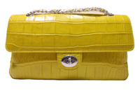 Женская сумка из натуральной крокодиловой кожи желтого цвета, сумка в стиле Шанель размер сумки 11 дюймов. Ширина-27см. Высота-16см. Толщина -9см. Для пошива сумок данной модели используется натуральная кожа сиамского крокодила брюшная часть. Крокодиловая кожа высокого качества выделки и окраса, кожа мягкая, упругая и эластичная, очень приятая на ощупь. На лицевой поверхности сумки распложен откидывающийся вверх лицевой клапан, в нижней части клапан крепится на поворотный замок. Все внешние части сумки: лицевой клапан, лицевая поверхность под клапаном, обратная часть сумки, дно и боковые вставки, все эти поверхности выполнены из натуральной крокодиловой кожи. В верхней части сумки устроен плечевой ремень, плечевой ремень в виде металлической цепочки оплетенной кожей теленка, цвет кожи теленка подобран под цвет крокодиловой кожи. Плоским карманам на молнии крокодиловая сумка внутри разделена на два отделения, для дополнительного удобства пользования внутри сумки устроены удобные карманы, накладные и карман на молнии. В качестве материала подклада использована натуральная кожа теленка, цвет кожи теленка подобран под цвет крокодиловой кожи.