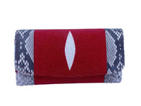 Женский кошелек из натуральной кожи морского ската красного цвета и натуральной кожи питона натурального окраса. Одна из самых популярных моделей женского большого, трехскладного кошелька, кошелек из кожи ската и питона, очень удачное сочетание материалов и цветов, а также формы и функциональности кошельков данной модели делают их одними из самых популярных в линейке кошельков из кожи морского ската. Главным украшением данного кошелька является вставка из кожи морского ската расположенная в центральной части лицевого клапана, в качестве украшения мы видим ромбовидный глазок белого цвета, в качестве дополнительного украшения слева и справа от центральной вставки выполнены вставки из натуральной кожи питона, спинной части в натуральном окрасе. Обратная части кошелька также изготовлена из кожи морского ската и кожи питона. На обратной стороне кошелька выполнен удобный плоский карман. Кошелек правильной прямоугольной формы, с лицевым клапаном округлой формы, тройного сложения внутри состоит из: Пары отделений для банкнотов, одного плоского отделения на молнии расположенного в последнем отделении для банкнот, одного плоского кармашка, устроенного за плоским отделением на молнии. Суммарно внутри кошелька выполнено двенадцать слотов для различных карточек, один из слотов выполнен с прозрачной сеточкой. Два широких плоских кармана выполнено под отделениями для карточек. Мягкая кожа теленка, подобранная по цвету под цвет кожи морского ската и текстиль применены в кошельках данной модели в качестве материала подклада.