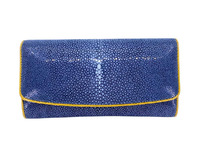 Женский кошелек тройного сложения из натуральной полированной кожи морского ската темно-синего цвета. Женский кошельки данной модели из полированной кожи морского ската отшиваются довольно редко и их предложение всегда ограниченно. Для пошива данных кошельков фабрика использует натуральную кожу морского ската, кожу полированную, высшего сорта, на ощупь кожа эластичная, при прикасании к полированной поверхности вы ощутите приятную прохладу и гладко стеклянную поверхность полированной кожи морского ската. Кошелек большой, функциональный, широкий, с повышенной вместимостью, правильной прямоугольной формы, с округлым лицевым передним клапаном с плоским карманом на обратной стороне кошелька. Лицевой клапан украшен выбеленной полоской из крупнозернистых камушков, эта выбеленная, светловатая полоска есть центральная часть спинки шкурки морского ската. Лицевой клапан фиксируется на металлическую магнитную кнопку. Внутри кошелька устроен еще один клапан, этот клапан фиксируется на кожаном хлястике с металлической кнопкой и этот клапан откидывается вниз. Внутри кошелька выполнено: Двенадцать слотов для карточек один из которых с сеткой, два плоских кармана устроенных под слотом для карточек, двумя отделениями для банкнот, плоским широким кармашком-отделением на молнии и плоским широким кармашком-отделением, устроенным за отделением на молнии. Для внутреннего убранства данных кошельков из полированной кожи морского ската использована натуральная кожа теленка и текстиль.