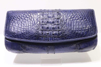 Женская плечевая сумка, ручной клатч из кожи крокодила темно-синего цвета. Ширина-21см, высота-10см, толщина-7см. Для пошива клатчей данной модели используется натуральная кожа крокодила. На лицевой части клатча устроен откидывающийся вверх лицевой клапан. Лицевая поверхность, лицевой клапан, обратная часть клатча выполнены из крокодиловой кожи. Для придания клатчу большей эластичности, боковые поверхности выполнены с применением натуральной кожи теленка под цвет крокодиловой кожи. Крокодиловый клатч данной модели может использоваться и как ручной клатч и как маленькая плечевая сумка. В комплекте с данным клатчем поставляется металлическая цепочка при необходимости используемая как съемный плечевой ремень. Звенья цепочки оплетены кожаным шнурком. Крепление цепочки к клатчу выполняется через D-образные кольца, вшитые на внутренней поверхности лицевого клапана. Плоской стенкой внутренний объем клатча разделен на два отделения, внутри этих отделений устроены кармашки для предметов первой необходимости, плоские кармашки для карточек, один плоский кармашек с прозрачным окошком, плоский, на всю ширину клатча карман на молнии, еще один плоский карман устроенный за кармашком на молнии. В качестве материала подклада используется текстиль и кожа теленка. Цвет кожи теленка подобран под цвет кожи крокодила.