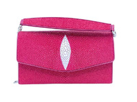 Клатч женский из натуральной кожи морского ската малинового цвета. При пошиве клатчей данной модели используется натуральная кожа морского ската, кожа высокого качества выделки и окраса, крупнозернистая, мягкая и приятная на ощупь. Женская сумка-клатч прямоугольной формы, на лицевой части клатча выполнен откидывающийся вверх лицевой клапан, клапан фиксируется на металлическую магнитную кнопку. Лицевой клапан украшен белым ромбовидным глазком, такой глазок — это характерная черта кожи морского ската, при окрашивании кожи морского ската центральную, крупнозернистую часть шкурки ската выделяют белым ромбообразным глазком. Для удобства пользования сумкой-клатчем данной модели в комплекте с клатчем поставляется съемная ручка и съемный плечевой ремень. Съемная ручка выполнена на основании из кожи теленка, внешняя часть ручки выполнена в коже ската под цвет изделия, съемный плечевой ремень выполнен из кожи теленка, кожа теленка подобрана под цвет кожи морского ската. Внутри лицевого клапана устроены D-образные кольца для крепления верхней ручки и или плечевого ремня. Внутри клатч состоит из: двух плоских отделений в которых можно хранить документы, ключи, небольшую косметику и мобильный телефон и одного отделения на молнии. В отделении на молнии устроено два отделения для банкнот, ключей и любых иных мелких ценных предметов. На лицевой части клатча выполнены два отделения для карточек. На обратной стороне клатча устроен удобный плоский карман с доступом из верхней части, карман выполнен на всю ширину сумки-клатча. В качестве материала подклада используется натуральная кожа теленка и текстиль, материалы подобраны под цвет кожи морского ската. Сумки клатчи данной модели являются популярными и выпускаются в различных цветах, как однотонных классических, так и с различными узорами.