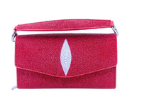 Клатч женский из натуральной кожи морского ската красного цвета. При пошиве клатчей данной модели используется натуральная кожа морского ската, кожа высокого качества выделки и окраса, крупнозернистая, мягкая и приятная на ощупь. Женская сумка-клатч прямоугольной формы, на лицевой части клатча выполнен откидывающийся вверх лицевой клапан, клапан фиксируется на металлическую магнитную кнопку. Лицевой клапан украшен белым ромбовидным глазком, такой глазок — это характерная черта кожи морского ската, при окрашивании кожи морского ската центральную, крупнозернистую часть шкурки ската выделяют белым ромбообразным глазком. Для удобства пользования сумкой-клатчем данной модели в комплекте с клатчем поставляется съемная ручка и съемный плечевой ремень. Съемная ручка выполнена на основании из кожи теленка, внешняя часть ручки выполнена в коже ската под цвет изделия, съемный плечевой ремень выполнен из кожи теленка, кожа теленка подобрана под цвет кожи морского ската. Внутри лицевого клапана устроены D-образные кольца для крепления верхней ручки и или плечевого ремня. Внутри клатч состоит из: двух плоских отделений в которых можно хранить документы, ключи, небольшую косметику и мобильный телефон и одного отделения на молнии. В отделении на молнии устроено два отделения для банкнот, ключей и любых иных мелких ценных предметов. На лицевой части клатча выполнены два отделения для карточек. На обратной стороне клатча устроен удобный плоский карман с доступом из верхней части, карман выполнен на всю ширину сумки-клатча. В качестве материала подклада используется натуральная кожа теленка и текстиль, материалы подобраны под цвет кожи морского ската. Сумки клатчи данной модели являются популярными и выпускаются в различных цветах, как однотонных классических, так и с различными узорами.