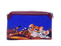 Женский клатч из натуральной кожи морского ската, синего цвета с принтом из двух маленьких львят. Для пошива клатчей данной модели используется натуральная, высокого качества выделки и окраса кожа морского ската, кожа эластичная и крупнозернистая. В верхней части клатча вшита удобная металлическая молния, вокруг молнии выполнена вставка из натуральной кожи теленка винного цвета. В качестве основного украшения данной плечевой сумочки изображение двух львят на темно-синем фоне выполнено на обеих сторонах изделия. В верхней части сумки, слева и справа вшиты металлические D- образные кольца для крепления съемного плечевого ремня. Съемный плечевой ремень, шириной 1,5см, длиной 130см, с возможностью регулировки по длине поставляется в комплекте с данным клатчем. Плечевой ремень выполнен из натуральной кожи теленка винного цвета. Дно сумочки-клатча выполнено из натуральной кожи теленка винного цвета. Внутри сумка клатч выполнены в одном объеме, для дополнительного удобства пользования клатчем внутри устроены удобные карманы, сдвоенный боковой накладной и на противоположной стороне вшивной боковой карман на молнии, в качестве дополнительного украшения, на внутреннем кармане, вокруг молнии выполнена декоративная вставка-рамочка из кожи теленка. Сумочки-клатчи данной модели выпускаются как в разноцветной окраске в различными принтами, так и в одноцветной окраске с белым ромбообразным глазком.