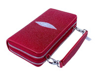 Женский клатч красного цвета изготовлен из натуральной кожи морского ската. Клатч прямоугольной формы, выполнен из двух независимых отделений каждое из которых закрывается на отдельную металлическую молнию. На лицевой части клатча в качестве основного украшения расположен вертикальный ромбообразный белый глазок. Белым глазком при классическом окрашивании кожи морского ската выделяют центральную часть спины шкуры морского ската. Для удобства пользования клатч из кожи оборудован съемной ручкой и съемным плечевым ремешком. Для крепления съемной ручки и плечевого ремня в процессе изготовления клатча были устроены металлические кольца. Между двумя молниями вшиты D-образные кольца для крепления съемных ручки и плечевого ремня. Съемная ручка выполнены с применением натуральной кожи морского ската окрашенной под цвет изделия и кожи теленка. Съемный плечевой ремень выполнен из натуральной кожи теленка, плечевой ремень с возможностью регулировки по длине. Ширина ремня 1,5см длина плечевого ремня 130см. Клатч выполнен из двух независимых отделений. В одном из отделений устроен удобный плоский карман на молнии, карман выполнен на всю ширину клатча и может быть использован как отделение для мелкий предметов или для монет, слева и справа от кармана на молнии устроено по одному отделению в котором можно хранить как банкноты, так и телефон. Слева и справа от этих отделений устроены восемь слотов для различных карточек, за отделениями для карточек устроено по одному широкому плоскому карману, устроенному на всю ширину клатча. Во втором отделении устроено четыре отделения для банкнот, мобильного телефона, документов и других предметов первой необходимости. В качестве материала подклада используется текстиль и натуральная кожа теленка текстиль, и кожа теленка подобраны под цвет кожи морского ската. Данная модель женских клатчей из кожи морского ската является удобной и популярной моделью и отшивается из кожи ската в различных цветах.