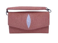 Клатч женский из натуральной кожи морского ската цвета сакура. При пошиве клатчей данной модели используется натуральная кожа морского ската, кожа высокого качества выделки и окраса, крупнозернистая, мягкая и приятная на ощупь. Женская сумка-клатч прямоугольной формы, на лицевой части клатча выполнен откидывающийся вверх лицевой клапан, клапан фиксируется на металлическую магнитную кнопку. Лицевой клапан украшен белым ромбовидным глазком, такой глазок — это характерная черта кожи морского ската, при окрашивании кожи морского ската центральную, крупнозернистую часть шкурки ската выделяют белым ромбообразным глазком. Для удобства пользования сумкой-клатчем данной модели в комплекте с клатчем поставляется съемная ручка и съемный плечевой ремень. Съемная ручка выполнена на основании из кожи теленка, внешняя часть ручки выполнена в коже ската под цвет изделия, съемный плечевой ремень выполнен из кожи теленка, кожа теленка подобрана под цвет кожи морского ската. Внутри лицевого клапана устроены D-образные кольца для крепления верхней ручки и или плечевого ремня. Внутри клатч состоит из: двух плоских отделений в которых можно хранить документы, ключи, небольшую косметику и мобильный телефон и одного отделения на молнии. В отделении на молнии устроено два отделения для банкнот, ключей и любых иных мелких ценных предметов. На лицевой части клатча выполнены два отделения для карточек. На обратной стороне клатча устроен удобный плоский карман с доступом из верхней части, карман выполнен на всю ширину сумки-клатча. В качестве материала подклада используется натуральная кожа теленка и текстиль, материалы подобраны под цвет кожи морского ската. Сумки клатчи данной модели являются популярными и выпускаются в различных цветах, как однотонных классических, так и с различными узорами.