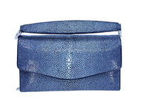 Клатч женский из натуральной полированной кожи морского ската черного цвета. При пошиве клатчей данной модели используется натуральная кожа морского ската, кожа высокого качества выделки и окраса, крупнозернистая, мягкая и приятная на ощупь. Женская сумка-клатч прямоугольной формы, на лицевой части клатча выполнен откидывающийся вверх лицевой клапан, клапан фиксируется на металлическую магнитную кнопку. Лицевой клапан украшен белыми крупными зернами шкурки морского ската. Для удобства пользования сумкой-клатчем данной модели в комплекте с клатчем поставляется съемная ручка и съемный плечевой ремень. Съемная ручка выполнена на основании из кожи теленка, внешняя часть ручки выполнена в коже ската под цвет изделия, съемный плечевой ремень выполнен из кожи теленка, кожа теленка подобрана под цвет кожи морского ската. Внутри лицевого клапана устроены D-образные кольца для крепления верхней ручки и или плечевого ремня. Внутри клатч состоит из: двух плоских отделений в которых можно хранить документы, ключи, небольшую косметику и мобильный телефон и одного отделения на молнии. В отделении на молнии устроено два отделения для банкнот, ключей и любых иных мелких ценных предметов. На лицевой части клатча выполнены два отделения для карточек. На обратной стороне клатча устроен удобный плоский карман с доступом из верхней части, карман выполнен на всю ширину сумки-клатча. В качестве материала подклада используется натуральная кожа теленка и текстиль, материалы подобраны под цвет кожи морского ската.