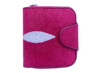 Женский складной кошелек из натуральной кожи морского ската малинового цвета. Даная модель женского кошелька из кожи морского ската придется по вкусу тем из вас, кто отдает предпочтение компактным складным кошелькам с хорошим функционалом. Для пошива кошельков данной модели используется натуральная кожа морского ската, лицевая сторона данного кошелька украшена белым ромбообразным глазком белого цвета. Кошелек изготовлен из одного целого куска морского ската. Данная модель кошелька очень интересная, основной объем кошелька закрывается на внешний хлястик который выполнен из натуральной кожи морского ската, внутри основного объема кошелек состоит из двойного отделения для купюр доступ в это отделение устроен в верхней части кошелька, из пяти отделений для карточек, одно из отделений выполнено с прозрачным окошком, вместо пластиковой вставки в прозрачном окошке используется сеточка. Снаружи кошелька устроено внешнее независимое отделение на металлической хромированной молнии, внутри отделения на молнии устроено два кармашка в которых можно хранить как монеты, так и сложенные банкноты. Мягкая, натуральная кожа теленка, подобранная по цвету под цвет кожи морского ската и текстиль применены комбинированно внутри кошелька в качестве материалов подклада. Женские кошельки данной модели изготавливаются в различных, в том числе ярких цветах.