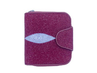 Женский складной кошелек из натуральной кожи морского ската винного цвета. Даная модель женского кошелька из кожи морского ската придется по вкусу тем из вас, кто отдает предпочтение компактным складным кошелькам с хорошим функционалом. Для пошива кошельков данной модели используется натуральная кожа морского ската, лицевая сторона данного кошелька украшена белым ромбообразным глазком белого цвета. Кошелек изготовлен из одного целого куска морского ската. Данная модель кошелька очень интересная, основной объем кошелька закрывается на внешний хлястик который выполнен из натуральной кожи морского ската, внутри основного объема кошелек состоит из двойного отделения для купюр доступ в это отделение устроен в верхней части кошелька, из пяти отделений для карточек, одно из отделений выполнено с прозрачным окошком, вместо пластиковой вставки в прозрачном окошке используется сеточка. Снаружи кошелька устроено внешнее независимое отделение на металлической хромированной молнии, внутри отделения на молнии устроено два кармашка в которых можно хранить как монеты, так и сложенные банкноты. Мягкая, натуральная кожа теленка, подобранная по цвету под цвет кожи морского ската и текстиль применены комбинированно внутри кошелька в качестве материалов подклада. Женские кошельки данной модели изготавливаются в различных, в том числе ярких цветах.