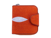 Женский складной кошелек из натуральной кожи морского ската оранжевого цвета. Даная модель женского кошелька из кожи морского ската придется по вкусу тем из вас, кто отдает предпочтение компактным складным кошелькам с хорошим функционалом. Для пошива кошельков данной модели используется натуральная кожа морского ската, лицевая сторона данного кошелька украшена белым ромбообразным глазком белого цвета. Кошелек изготовлен из одного целого куска морского ската. Данная модель кошелька очень интересная, основной объем кошелька закрывается на внешний хлястик который выполнен из натуральной кожи морского ската, внутри основного объема кошелек состоит из двойного отделения для купюр доступ в это отделение устроен в верхней части кошелька, из пяти отделений для карточек, одно из отделений выполнено с прозрачным окошком, вместо пластиковой вставки в прозрачном окошке используется сеточка. Снаружи кошелька устроено внешнее независимое отделение на металлической хромированной молнии, внутри отделения на молнии устроено два кармашка в которых можно хранить как монеты, так и сложенные банкноты. Мягкая, натуральная кожа теленка, подобранная по цвету под цвет кожи морского ската и текстиль применены комбинированно внутри кошелька в качестве материалов подклада. Женские кошельки данной модели изготавливаются в различных, в том числе ярких цветах.