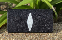 Вы можете купить кошелек данной модели с доставкой напрямую из Таиланда без посредников, доставка в Россию бесплатно. Популярная модель женского кошелька из натуральной кожи морского ската с металлическим отделением для монет, цвет черный, ширина -19см, высота -10см, толщина – 3,5см. Большой, крупный, вместительный, классический, женский кошелек из натуральной кожи морского ската с металлической монетницей. При пошиве кошельков данной модели используется натуральная кожа морского ската, кожа мягкая, приятая на ощупь, крупнозернистая, высокого качества выделки и окраса. В качестве основного украшения кошелька, на откидывающемся вверх лицевом клапане расположен вертикальный белый глазок. Белыми глазками при выделке и окрашивании кожи ската выделяют центральную часть шкурки морского ската. Лицевой клапан откидывается вверх и в нижней части крепится на металлическую магнитную кнопку. На обратной стороне кошелька устроен плоский карман, карман выполнен на всю ширину кошелька. Внутреннее наполнение кошелька состоит из: на внутренней поверхности лицевого клапана устроено шесть отделений для карточек, одно из которых с прозрачным окошком, два удобных широких плоских кармана устроенных под отделениями для карточек, карманы выполнены на всю ширину кошелька. В нижней части кошелька выполнено четыре отделения для карточек, металлическое отделение для монет состоящее внутри из двух кармашков, тремя отделениями для банкнот расположенные за металлическим отделением для монет и одним отделением на молнии расположенным на внутренней части сгиба лицевого клапана. Внутреннее убранство кошелька выполнено из натуральной кожи теленка. Женские кошельки из кожи морского ската данной модели являются популярными, и они отшиваются в нескольких популярных цветах.