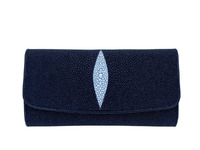 Женский кошелек из натуральной кожи морского ската черного цвета. Кошелек женский, большой, трехскладный из кожи ската. Кошельки данной модели понравятся тем из вас, кто предпочитает крупноформатные трехскладные кошельки, вместительные с хорошим функционалом. Данная модель кошельков из кожи ската является эталоном женского большого кошелька и отшивается как коже морского ската различных цветов, так и в других сортах экзотической кожи. Для пошива данных кошельков используется натуральная кожа морского ската, натуральная кожа теленка, подобранная по цвету под цвет кожи морского ската и текстиль. Лицевой клапан кошелька и его обратная сторона выполнены из натуральной, крупнозернистой кожи морского ската, кожа высокого качества выделки и окраса, эластичная и очень приятная на ощупь. Лицевой клапан украшен вертикальным белым глазком, такого рода белые глазки это центральная крупнозернистая спинная часть шкурки морского ската, выделяемая при классическом окрашивании кожи ската белым цветом. На обратной стороне кошелька выполнен широкий, на всю ширину кошелька плоский карман, доступ в карман устроен в верхней части кошелька. На внутренней поверхности лицевого клапана, в нижней его части выполнена металлическая магнитная кнопка, этой магнитной кнопкой лицевой клапан фиксируется к кошельку, ответная кнопка устроена на лицевой поверхности кошелька, под клапаном. Кошелек широкий, тройного сложения. Внутри кошелька, на лицевой поверхности устроен кожаный хлястик, отстегнув который вы получаете доступ к отделениям с карточками. В этом отделении выполнено двенадцать отделений для карточек, одно из которых с прозрачным окошком и два плоских кармана с доступом из центральной части того складного отделения, эти плоский карманы изготовлены на всю ширину кошелька. Также кошелек оборудован двумя отделениями для банкнот. Кошельки данной модели не имеют специального объемного отделения монетница, но эти кошельки оборудованы удобным плоским карманом на молнии. Этот карман расположен в последнем отделении для банкнот и может использоваться и как монетница и как отделение для иных мелких ценных предметов. За этим отделением ка молнии выполнен еще один плоский карман на всю ширину кошелька. Высококачественная кожа теленка и текстиль используются в качестве материала подклада данного кошелька из кожи морского ската.