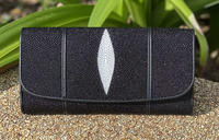 Вы можете купить кошелек данной модели с доставкой напрямую из Таиланда без посредников, доставка в Россию бесплатно. Классический женский кошелек тройного сложения из натуральной кожи морского ската с белым глазком. Цвет черный, ширина-19см, высота-10,5см, толщина- 3,5см. Для пошива кошельков данной модели используется натуральная кожа морского ската высокого качества выделки и окраса, кожа мягкая, крупнозернистая, упругая и эластичная, и очень приятная на ощупь. Это самая бюджетная модель женского трехскладного кошелька из кожи морского ската. дело в том, что как вы можете увидеть на фото, лицевой клапан, и обратная сторона кошелька выполнены не из цельных кусков кожи ската, а собраны из трех частей, отчасти такая сборка добавляет привлекательности кошельку. На передней части кошелька расположен откидывающийся вверх лицевой клапан, в нижней части клапан фиксируется на металлическую магнитную кнопку. Основным украшением кошелька является белый вертикальный глазок. С помощью белого вертикального глазка при выделке кожи морского ската выделяют центральную часть шкурки морского ската. На обратной стороне кошелька устроен удобный плоский карман на всю ширину кошелька из кожи ската. Внутреннее наполнение кошелька состоит из: в нижней части кошелька расположены шесть отделений для различных карточек, одно из этих отделений с прозрачным окошком, под отделениями ля карточек устроено два удобных плоских кармана выполненных на всю ширину кошелька. В центральной части кошелька устроено шесть отделений для карточек, два отделения доя банкнот, одно плоское отделение на молнии устроенное за отделениям для банкнот. Это отделение на молнии можно использовать как отделение для хранения мелких предметов и или как отделение для монет. За отделением на молнии устроен широкий, на всю ширину кошелька плоский карман. В качестве материала подклада используется натуральная кожа теленка под цвет кожи морского ската и текстиль. Кошельки данной модели являются классическими кошельками из кожи морского ската и понравятся тем из вас, кто отдает предпочтение крупноразмерным складным кошелькам с повышенным функционалом. Обращаю ваше внимание на то, что данный кошелек из кожи ската имеет ширину 19см, и поместит его в сумочку маленького размера будет несколько затруднительно. Кошельки из тройного сложения данной модели выпускаются в различных комбинациях экзотической кожи таких как кожа ската-питона, питона, варана, игуаны, ящерицы и коже крокодила.