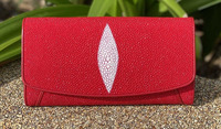 Вы можете купить кошелек данной модели с доставкой напрямую из Таиланда без посредников, доставка в Россию бесплатно. Классический женский кошелек тройного сложения из натуральной кожи морского ската с белым глазком. Цвет красный, ширина-19см, высота-10,5см, толщина- 3,5см. Для пошива кошельков данной модели используется натуральная кожа морского ската высокого качества выделки и окраса, кожа мягкая, крупнозернистая, упругая и эластичная, и очень приятная на ощупь. На передней части кошелька расположен откидывающийся вверх лицевой клапан, в нижней части клапан фиксируется на металлическую магнитную кнопку. Основным украшением кошелька является белый вертикальный глазок. С помощью белого вертикального глазка при выделке кожи морского ската выделяют центральную часть шкурки морского ската. На обратной стороне кошелька устроен удобный плоский карман на всю ширину кошелька из кожи ската. Внутреннее наполнение кошелька состоит из: в нижней части кошелька расположены шесть отделений для различных карточек, одно из этих отделений с прозрачным окошком, под отделениями ля карточек устроено два удобных плоских кармана выполненных на всю ширину кошелька. В центральной части кошелька устроено шесть отделений для карточек, два отделения доя банкнот, одно плоское отделение на молнии устроенное за отделениям для банкнот. Это отделение на молнии можно использовать как отделение для хранения мелких предметов и или как отделение для монет. За отделением на молнии устроен широкий, на всю ширину кошелька плоский карман. В качестве материала подклада используется натуральная кожа теленка под цвет кожи морского ската и текстиль. Кошельки данной модели являются классическими кошельками из кожи морского ската и понравятся тем из вас, кто отдает предпочтение крупноразмерным складным кошелькам с повышенным функционалом. Обращаю ваше внимание на то, что данный кошелек из кожи ската имеет ширину 19см, и поместит его в сумочку маленького размера будет несколько затруднительно. Кошельки из тройного сложения данной модели выпускаются в различных комбинациях экзотической кожи таких как кожа ската-питона, питона, варана, игуаны, ящерицы и коже крокодила.