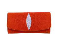 Женский кошелек из натуральной кожи морского ската оранжевого цвета. Кошелек женский, большой, трехскладный из кожи ската. Кошельки данной модели понравятся тем из вас, кто предпочитает крупноформатные трехскладные кошельки, вместительные с хорошим функционалом. Данная модель кошельков из кожи ската является эталоном женского большого кошелька и отшивается как коже морского ската различных цветов, так и в других сортах экзотической кожи. Для пошива данных кошельков используется натуральная кожа морского ската, натуральная кожа теленка, подобранная по цвету под цвет кожи морского ската и текстиль. Лицевой клапан кошелька и его обратная сторона выполнены из натуральной, крупнозернистой кожи морского ската, кожа высокого качества выделки и окраса, эластичная и очень приятная на ощупь. Лицевой клапан украшен вертикальным белым глазком, такого рода белые глазки это центральная крупнозернистая спинная часть шкурки морского ската, выделяемая при классическом окрашивании кожи ската белым цветом. На обратной стороне кошелька выполнен широкий, на всю ширину кошелька плоский карман, доступ в карман устроен в верхней части кошелька. На внутренней поверхности лицевого клапана, в нижней его части выполнена металлическая магнитная кнопка, этой магнитной кнопкой лицевой клапан фиксируется к кошельку, ответная кнопка устроена на лицевой поверхности кошелька, под клапаном. Кошелек широкий, тройного сложения. Внутри кошелька, на лицевой поверхности устроен кожаный хлястик, отстегнув который вы получаете доступ к отделениям с карточками. В этом отделении выполнено двенадцать отделений для карточек, одно из которых с прозрачным окошком и два плоских кармана с доступом из центральной части того складного отделения, эти плоский карманы изготовлены на всю ширину кошелька. Также кошелек оборудован двумя отделениями для банкнот. Кошельки данной модели не имеют специального объемного отделения монетница, но эти кошельки оборудованы удобным плоским карманом на молнии. Этот карман расположен в последнем отделении для банкнот и может использоваться и как монетница и как отделение для иных мелких ценных предметов. За этим отделением ка молнии выполнен еще один плоский карман на всю ширину кошелька. Высококачественная кожа теленка и текстиль используются в качестве материала подклада данного кошелька из кожи морского ската.