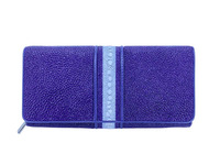 Женский кошелек с отделением для монет из натуральной кожи морского ската фиолетового цвета. При пошиве кошельков данной модели, фабрика использовала натуральную кожу морского ската и натуральную кожу теленка подобранную по цвету, под цвет кожи ската. Женские кошельки из кожи ската данной модели придутся по вкусу тем из вас, кто отдает предпочтение крупноразмерам кошелькам, с повышенным функционалом, местами для карточек, банкнот и отделением для монет. Лицевая и обратная стороны кошелька выполнены с применением натуральной кожи ската. В качестве дополнительного украшения кошелька на лицевой и обратной частях кошелька выполнена вставка из крупнозернистой кожи морского ската белого цвета. Данная вставка изготовлена из натуральной кожи морского ската Row Stone это отдельный сорт кожи морского ската, где его центральная часть спинки полностью состоит из крупных «камушков» полоской по всей длине шкуры. Эту полоску камушков называют Row Stone и обычно, при окрашивании кожи морского ската выделяют белым цветом. На обратной стороне кошелька устроен удобный широкий карман, карман плоский, выполнен на всю ширину и высоту кошелька. Передний откидывающийся вверх лицевой клапан выполнен из кожи морского ската, на лицевой части кошелька клапан фиксируется на металлическую магнитную кнопку. Внутри кошелек состоит из четырех отделений для карточек, расположенных на передней часть кошелька, под лицевым клапаном. Шести отделений для карточек устроенных на внутренней части откидывающегося вверх лицевого клапана, одно их этих отделений выполнено с прозрачным окошком и двумя широкими и плоскими кармашками, расположенными под этими отделениями для карточек. Двух отделений для банкнот, одного отделения на для монет закрывающегося на металлическую молнию П-образной формы. Внутри отделение для монет состоит из двух кармашков. Одного плоского кармашка на молнии расположенного в последнем отделении для банкнот, и одного плоского кармашка, выполненного за плоским отделением на молнии. Текстиль и натуральная кожа теленка использованы для внутреннего убранства данных кошельков из кожи морского ската. Данные женские кошельки из кожи морского ската отшиваются сериями и доступны в различных цветах.