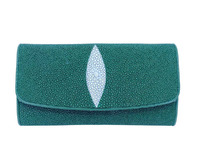 Женский кошелек из натуральной кожи морского ската темно-зеленого цвета. Кошелек женский, большой, трехскладный из кожи ската. Кошельки данной модели понравятся тем из вас, кто предпочитает крупноформатные трехскладные кошельки, вместительные с хорошим функционалом. Данная модель кошельков из кожи ската является эталоном женского большого кошелька и отшивается как коже морского ската различных цветов, так и в других сортах экзотической кожи. Для пошива данных кошельков используется натуральная кожа морского ската, натуральная кожа теленка, подобранная по цвету под цвет кожи морского ската и текстиль. Лицевой клапан кошелька и его обратная сторона выполнены из натуральной, крупнозернистой кожи морского ската, кожа высокого качества выделки и окраса, эластичная и очень приятная на ощупь. Лицевой клапан украшен вертикальным белым глазком, такого рода белые глазки это центральная крупнозернистая спинная часть шкурки морского ската, выделяемая при классическом окрашивании кожи ската белым цветом. На обратной стороне кошелька выполнен широкий, на всю ширину кошелька плоский карман, доступ в карман устроен в верхней части кошелька. На внутренней поверхности лицевого клапана, в нижней его части выполнена металлическая магнитная кнопка, этой магнитной кнопкой лицевой клапан фиксируется к кошельку, ответная кнопка устроена на лицевой поверхности кошелька, под клапаном. Кошелек широкий, тройного сложения. Внутри кошелька, на лицевой поверхности устроен кожаный хлястик, отстегнув который вы получаете доступ к отделениям с карточками. В этом отделении выполнено двенадцать отделений для карточек, одно из которых с прозрачным окошком и два плоских кармана с доступом из центральной части того складного отделения, эти плоский карманы изготовлены на всю ширину кошелька. Также кошелек оборудован двумя отделениями для банкнот. Кошельки данной модели не имеют специального объемного отделения монетница, но эти кошельки оборудованы удобным плоским карманом на молнии. Этот карман расположен в последнем отделении для банкнот и может использоваться и как монетница и как отделение для иных мелких ценных предметов. За этим отделением ка молнии выполнен еще один плоский карман на всю ширину кошелька. Высококачественная кожа теленка и текстиль используются в качестве материала подклада данного кошелька из кожи морского ската.