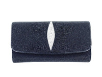Вы можете купить кошелек данной модели с доставкой напрямую из Таиланда без посредников, доставка в Россию бесплатно. Классический женский кошелек тройного сложения из натуральной кожи морского ската. Цвет черный, ширина-19см, высота-10,5см, толщина- 3,5см. Для пошива кошельков данной модели используется натуральная кожа морского ската высокого качества выделки и окраса, кожа мягкая, крупнозернистая, упругая и эластичная, и очень приятная на ощупь. На передней части кошелька расположен откидывающийся вверх лицевой клапан, в нижней части клапан фиксируется на металлическую магнитную кнопку. Основным украшением кошелька является белый вертикальный глазок. С помощью белого вертикального глазка при выделке кожи морского ската выделяют центральную часть шкурки морского ската. На обратной стороне кошелька устроен удобный плоский карман на всю ширину кошелька из кожи ската. Внутреннее наполнение кошелька состоит из: в нижней части кошелька расположены шесть отделений для различных карточек, одно из этих отделений с прозрачным окошком, под отделениями ля карточек устроено два удобных плоских кармана выполненных на всю ширину кошелька. В центральной части кошелька устроено шесть отделений для карточек, два отделения доя банкнот, одно плоское отделение на молнии устроенное за отделениям для банкнот. Это отделение на молнии можно использовать как отделение для хранения мелких предметов и или как отделение для монет. За отделением на молнии устроен широкий, на всю ширину кошелька плоский карман. В качестве материала подклада используется натуральная кожа теленка под цвет кожи морского ската и текстиль. Кошельки данной модели являются классическими кошельками из кожи морского ската и понравятся тем из вас, кто отдает предпочтение крупноразмерным складным кошелькам с повышенным функционалом. Обращаю ваше внимание на то, что данный кошелек из кожи ската имеет ширину 19см, и поместит его в сумочку маленького размера будет несколько затруднительно. Кошельки из тройного сложения данной модели выпускаются в различных комбинациях экзотической кожи таких как кожа ската-питона, питона, варана, игуаны, ящерицы и коже крокодила.