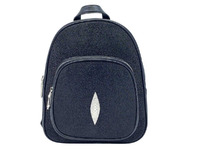 Рюкзак женский из кожи морского ската черного цвета. Для пошива рюкзаков данной модели используется натуральная кожа морского ската и натуральная кожа теленка. Кожа ската крупнозернистая, высшего качества выделки и окраса, кожа ската окрашена в классическом стиле, с вертикальным ромбообразным глазком, таким глазком выделяется центральная часть спинки шкуры морского ската. На лицевой части рюкзака устроен накладной карман, внешняя часть кармана выполнена в коже морского ската и украшена белым ромбовидным вертикальным глазком. Толщина этого кармана 3см, ширина 18см, и высота 18см. В верхней части кармана вшита П-образная металлическая молния, что позволяет более широко, а значит более удобно открыть карман и с большим удобством положить или достать что-то из кармана. В верхней части рюкзака вшито две металлических молнии, одна молния преграждает доступ в передний узкий карман, карман выполнен на всю ширину и высоту рюкзака. Вторая молния преграждает доступ в основной объем рюкзака. Внутри основного объема устроены удобные карманы: Боковой карман на молнии и на противоположной стороне накладной карман. В качестве материала подклада используется мягкий текстиль. Боковые вставки, дно, обратная сторона рюкзака, верхняя ручка и задние лямки выполнены из натуральной кожи теленка, кожа теленка по цвету подобрана под цвет кожи морского ската. Лямки рюкзака имеют регулировку по длине.