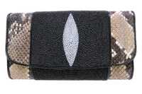 Женский складной кошелек из натуральной кожи морского ската и кожи питона, кошелек тройного сложения. Удобный, вместительный, функциональный женский кошелек из кожи ската. Для изготовления кошельков данной модели используется натуральная кожа морского ската, кожа высокого качества выделки и окраса, кожа крупнозернистая, мягкая, эластичная и очень приятная на ощупь, и натуральная кожа питона натурального цвета. На лицевой части кошелька мы видим белый овальный глазок, это характерная отличительная черта кожи ската, спинная часть шкурки ската. В качестве дополнительного украшения кошелька и разнообразия модельного ряда кошельков из кожи морского ската при пошиве кошельков данной модели была также использована натуральная кожа питона. Из кожи питона были устроены боковые вставки на кошельке из кожи ската. На обратной стороне кошелька устроен удобный плоский, широкий карман, карман выполнен на всю ширину кошелька. Кошелек состоит из шести отделений для карточек, одно из которых выполнено с прозрачным окошком, из двух плоских и широких карманов, устроенных на всю ширину кошелька, эти карманы расположены под отделением для карточек. В центральной части кошелька устроены еще шесть отделений для различных карточек, за отделениями для карточек устроено два отделения для банкнот, в последнем отделении для банкнот устроено плоское отделение на молнии, это отделение может быть использовано как отделение для монет или для хранения любых мелких предметов. За монетницей устроен еще один плоский широкий карман устроенный на всю ширину кошелька. В качестве материала подклада данного кошелька из кожи ската использована натуральная кожа теленка под цвет изделия и текстиль. Данные женские складные кошельки из кожи морского ската являются широко распространенной и популярной моделью женских кошельков и изготавливаются как из кожи ската в различных цветах и с различными принтами, так и из других сортов элитной экзотической кожи, кожи крокодила, кожи питона, кожи варана.