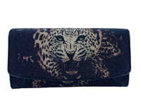 Одна из самых удачных и популярных женских моделей кошельков из натуральной кожи морского ската с притом в виде головы пантеры. Для пошива кошельков данной модели фабрика использует натуральную высококачественную кожу морского ската, кожа крупнозернистая, эластичная и очень приятная на ощупь. Кошелек тройного сложения или трайфолд, широкий, функциональный, вместительный, правильной прямоугольной формы на лицевой поверхности кошелька мы видим откидывающийся вверх лицевой клапан, лицевой клапан в нижней части имеет овальную форму, внутри клапана расположена магнитная кнопка-застежка, на эту кнопку лицевой клапан фиксируется к лицевой поверхности, на обратной стороне кошелька устроен плоский карман, карман выполнен на всю ширину и высоту кошелька, доступ в карман устроен на обратной стороне кошелька в верхней части. Лицевая часть кошелька, обратная поверхность и лицевой клапан данного кошелька выполнены с применением натуральной кожи морского ската. Внутри кошелек состоит из двух широких отделений для банкнот, одного плоского кармана на молнии этот карман на молнии расположен в одном из отделений для купюр. Данное отделение на молнии хоть и имеет плоскую форму, однако может быть использовано вами и как монетница, и как кармашек для хранения мелких ценных предметов. За отделением на молнии устроен широкий плоский карман. Также внутри кошелька выполнены двенадцать слотов для всевозможных карточек, один из слотов выполнен с прозрачным окошком. Два широких, на всю ширину кошелька, плоских кармана, расположены под слотом для шести карточек, тех, что с прозрачным окошком. Натуральная, высококачественная кожа теленка, утонченная для придания кошельку меньшего веса была использована при создании внутреннего наполнения женских кошельков из кожи морского ската данной модели, также внутри кошелька местами применен текстиль.