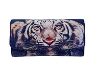 Одна из самых удачных и популярных женских моделей кошельков из натуральной кожи морского ската с притом в виде морды тигра. Для пошива кошельков данной модели фабрика использует натуральную высококачественную кожу морского ската, кожа крупнозернистая, эластичная и очень приятная на ощупь. Кошелек тройного сложения или трайфолд, широкий, функциональный, вместительный, правильной прямоугольной формы на лицевой поверхности кошелька мы видим откидывающийся вверх лицевой клапан, лицевой клапан в нижней части имеет овальную форму, внутри клапана расположена магнитная кнопка-застежка, на эту кнопку лицевой клапан фиксируется к лицевой поверхности, на обратной стороне кошелька устроен плоский карман, карман выполнен на всю ширину и высоту кошелька, доступ в карман устроен на обратной стороне кошелька в верхней части. Лицевая часть кошелька, обратная поверхность и лицевой клапан данного кошелька выполнены с применением натуральной кожи морского ската. Внутри кошелек состоит из двух широких отделений для банкнот, одного плоского кармана на молнии этот карман на молнии расположен в одном из отделений для купюр. Данное отделение на молнии хоть и имеет плоскую форму, однако может быть использовано вами и как монетница, и как кармашек для хранения мелких ценных предметов. За отделением на молнии устроен широкий плоский карман. Также внутри кошелька выполнены двенадцать слотов для всевозможных карточек, один из слотов выполнен с прозрачным окошком. Два широких, на всю ширину кошелька, плоских кармана, расположены под слотом для шести карточек, тех, что с прозрачным окошком. Натуральная, высококачественная кожа теленка, утонченная для придания кошельку меньшего веса была использована при создании внутреннего наполнения женских кошельков из кожи морского ската данной модели, также внутри кошелька местами применен текстиль.