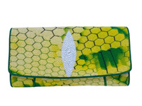 Одна из самых удачных и популярных женских моделей кошельков из натуральной кожи морского ската с принтом в виде сот зеленого цвета. Для пошива кошельков данной модели фабрика использует натуральную высококачественную кожу морского ската, кожа крупнозернистая, эластичная и очень приятная на ощупь. Кошелек тройного сложения или трайфолд, широкий, функциональный, вместительный, правильной прямоугольной формы на лицевой поверхности кошелька мы видим откидывающийся вверх лицевой клапан, лицевой клапан в нижней части имеет овальную форму, внутри клапана расположена магнитная кнопка-застежка, на эту кнопку лицевой клапан фиксируется к лицевой поверхности, на обратной стороне кошелька устроен плоский карман, карман выполнен на всю ширину и высоту кошелька, доступ в карман устроен на обратной стороне кошелька в верхней части. Лицевая часть кошелька, обратная поверхность и лицевой клапан данного кошелька выполнены с применением натуральной кожи морского ската. Внутри кошелек состоит из двух широких отделений для банкнот, одного плоского кармана на молнии этот карман на молнии расположен в одном из отделений для купюр. Данное отделение на молнии хоть и имеет плоскую форму, однако может быть использовано вами и как монетница, и как кармашек для хранения мелких ценных предметов. За отделением на молнии устроен широкий плоский карман. Также внутри кошелька выполнены двенадцать слотов для всевозможных карточек, один из слотов выполнен с прозрачным окошком. Два широких, на всю ширину кошелька, плоских кармана, расположены под слотом для шести карточек, тех, что с прозрачным окошком. Натуральная, высококачественная кожа теленка, утонченная для придания кошельку меньшего веса была использована при создании внутреннего наполнения женских кошельков из кожи морского ската данной модели, также внутри кошелька местами применен текстиль.