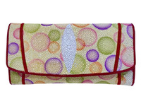 Одна из самых удачных и популярных женских моделей кошельков из натуральной кожи морского ската с притом в виде разноцветных кружочков. Для пошива кошельков данной модели фабрика использует натуральную высококачественную кожу морского ската, кожа крупнозернистая, эластичная и очень приятная на ощупь. Кошелек тройного сложения или трайфолд, широкий, функциональный, вместительный, правильной прямоугольной формы на лицевой поверхности кошелька мы видим откидывающийся вверх лицевой клапан, лицевой клапан в нижней части имеет овальную форму, внутри клапана расположена магнитная кнопка-застежка, на эту кнопку лицевой клапан фиксируется к лицевой поверхности, на обратной стороне кошелька устроен плоский карман, карман выполнен на всю ширину и высоту кошелька, доступ в карман устроен на обратной стороне кошелька в верхней части. Лицевая часть кошелька, обратная поверхность и лицевой клапан данного кошелька выполнены с применением натуральной кожи морского ската. Внутри кошелек состоит из двух широких отделений для банкнот, одного плоского кармана на молнии этот карман на молнии расположен в одном из отделений для купюр. Данное отделение на молнии хоть и имеет плоскую форму, однако может быть использовано вами и как монетница, и как кармашек для хранения мелких ценных предметов. За отделением на молнии устроен широкий плоский карман. Также внутри кошелька выполнены двенадцать слотов для всевозможных карточек, один из слотов выполнен с прозрачным окошком. Два широких, на всю ширину кошелька, плоских кармана, расположены под слотом для шести карточек, тех, что с прозрачным окошком. Натуральная, высококачественная кожа теленка, утонченная для придания кошельку меньшего веса была использована при создании внутреннего наполнения женских кошельков из кожи морского ската данной модели, также внутри кошелька местами применен текстиль.