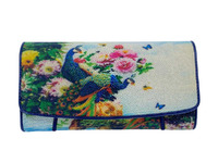 Одна из самых удачных и популярных женских моделей кошельков из натуральной кожи морского ската с притом в виде цветов и павлинов. Для пошива кошельков данной модели фабрика использует натуральную высококачественную кожу морского ската, кожа крупнозернистая, эластичная и очень приятная на ощупь. Кошелек тройного сложения или трайфолд, широкий, функциональный, вместительный, правильной прямоугольной формы на лицевой поверхности кошелька мы видим откидывающийся вверх лицевой клапан, лицевой клапан в нижней части имеет овальную форму, внутри клапана расположена магнитная кнопка-застежка, на эту кнопку лицевой клапан фиксируется к лицевой поверхности, на обратной стороне кошелька устроен плоский карман, карман выполнен на всю ширину и высоту кошелька, доступ в карман устроен на обратной стороне кошелька в верхней части. Лицевая часть кошелька, обратная поверхность и лицевой клапан данного кошелька выполнены с применением натуральной кожи морского ската. Внутри кошелек состоит из двух широких отделений для банкнот, одного плоского кармана на молнии этот карман на молнии расположен в одном из отделений для купюр. Данное отделение на молнии хоть и имеет плоскую форму, однако может быть использовано вами и как монетница, и как кармашек для хранения мелких ценных предметов. За отделением на молнии устроен широкий плоский карман. Также внутри кошелька выполнены двенадцать слотов для всевозможных карточек, один из слотов выполнен с прозрачным окошком. Два широких, на всю ширину кошелька, плоских кармана, расположены под слотом для шести карточек, тех, что с прозрачным окошком. Натуральная, высококачественная кожа теленка, утонченная для придания кошельку меньшего веса была использована при создании внутреннего наполнения женских кошельков из кожи морского ската данной модели, также внутри кошелька местами применен текстиль.