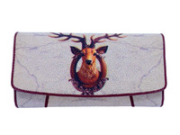 Одна из самых удачных и популярных женских моделей кошельков из натуральной кожи морского ската с принтом в виде головы оленя. Для пошива кошельков данной модели фабрика использует натуральную высококачественную кожу морского ската, кожа крупнозернистая, эластичная и очень приятная на ощупь. Кошелек тройного сложения или трайфолд, широкий, функциональный, вместительный, правильной прямоугольной формы на лицевой поверхности кошелька мы видим откидывающийся вверх лицевой клапан, лицевой клапан в нижней части имеет овальную форму, внутри клапана расположена магнитная кнопка-застежка, на эту кнопку лицевой клапан фиксируется к лицевой поверхности, на обратной стороне кошелька устроен плоский карман, карман выполнен на всю ширину и высоту кошелька, доступ в карман устроен на обратной стороне кошелька в верхней части. Лицевая часть кошелька, обратная поверхность и лицевой клапан данного кошелька выполнены с применением натуральной кожи морского ската. Внутри кошелек состоит из двух широких отделений для банкнот, одного плоского кармана на молнии этот карман на молнии расположен в одном из отделений для купюр. Данное отделение на молнии хоть и имеет плоскую форму, однако может быть использовано вами и как монетница, и как кармашек для хранения мелких ценных предметов. За отделением на молнии устроен широкий плоский карман. Также внутри кошелька выполнены двенадцать слотов для всевозможных карточек, один из слотов выполнен с прозрачным окошком. Два широких, на всю ширину кошелька, плоских кармана, расположены под слотом для шести карточек, тех, что с прозрачным окошком. Натуральная, высококачественная кожа теленка, утонченная для придания кошельку меньшего веса была использована при создании внутреннего наполнения женских кошельков из кожи морского ската данной модели, также внутри кошелька местами применен текстиль.