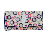 Одна из самых удачных и популярных женских моделей кошельков из натуральной кожи морского ската с принтом в виде разноцветных кружочков. Для пошива кошельков данной модели фабрика использует натуральную высококачественную кожу морского ската, кожа крупнозернистая, эластичная и очень приятная на ощупь. Кошелек тройного сложения или трайфолд, широкий, функциональный, вместительный, правильной прямоугольной формы на лицевой поверхности кошелька мы видим откидывающийся вверх лицевой клапан, лицевой клапан в нижней части имеет овальную форму, внутри клапана расположена магнитная кнопка-застежка, на эту кнопку лицевой клапан фиксируется к лицевой поверхности, на обратной стороне кошелька устроен плоский карман, карман выполнен на всю ширину и высоту кошелька, доступ в карман устроен на обратной стороне кошелька в верхней части. Лицевая часть кошелька, обратная поверхность и лицевой клапан данного кошелька выполнены с применением натуральной кожи морского ската. Внутри кошелек состоит из двух широких отделений для банкнот, одного плоского кармана на молнии этот карман на молнии расположен в одном из отделений для купюр. Данное отделение на молнии хоть и имеет плоскую форму, однако может быть использовано вами и как монетница, и как кармашек для хранения мелких ценных предметов. За отделением на молнии устроен широкий плоский карман. Также внутри кошелька выполнены двенадцать слотов для всевозможных карточек, один из слотов выполнен с прозрачным окошком. Два широких, на всю ширину кошелька, плоских кармана, расположены под слотом для шести карточек, тех, что с прозрачным окошком. Натуральная, высококачественная кожа теленка, утонченная для придания кошельку меньшего веса была использована при создании внутреннего наполнения женских кошельков из кожи морского ската данной модели, также внутри кошелька местами применен текстиль.
